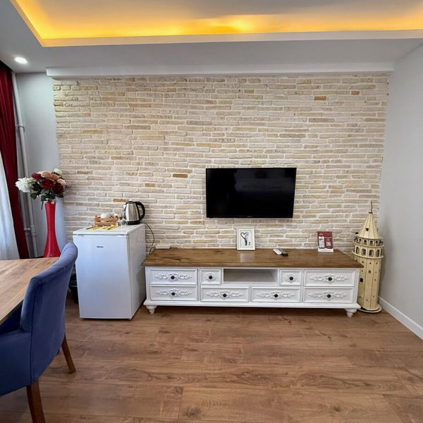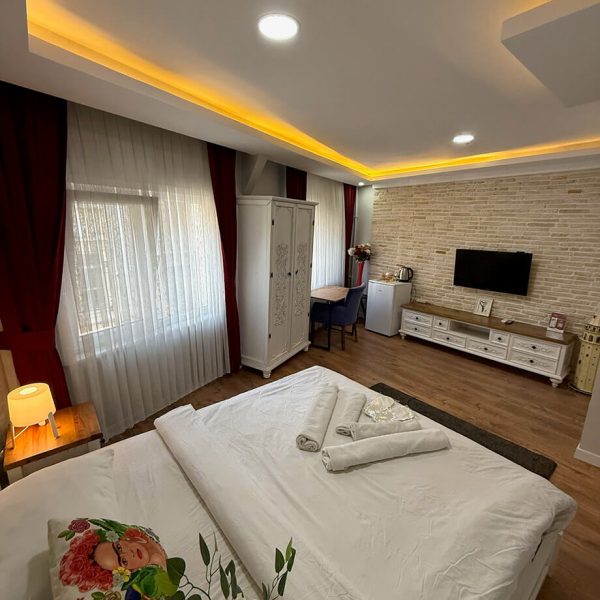 Çift kişilik odalarımızda kendilerine ait banyoları, yatak, televizyon, gardrop ve mini buzdolabı bulunmaktadır. Odalarımızda bulunan yataklar çift kişiliktir. Klima ve kaloriferle ısınma seçeneği bulunmaktadır. Binamızın ortak alanında bulunan çamaşırhane kısmı tüm misafirlerimiz tarafından ortak kullanılabilmekte ve çamaşır, kurutma makinelerimiz bulunmaktadır.